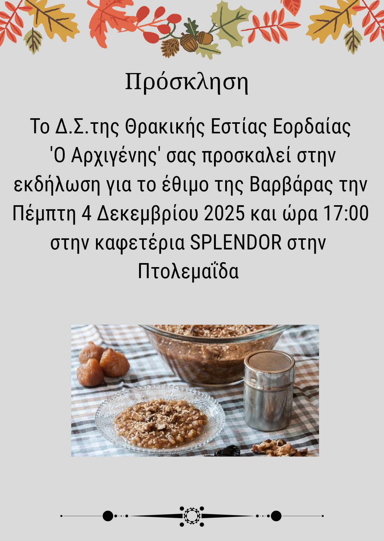 Η Θρακική Εστία Εορδαίας πιστή στις παραδόσεις και στα έθιμα,έτσι και φέτος τηρεί το έθιμο της Βαρβάρας το οποίο αποτελεί αναπόσπαστο κομμάτι της λαϊκής λατρευτικής παράδοσης της Θράκης και συνεχίζεται αδιάκοπα στο πέρασμα των αιώνων.