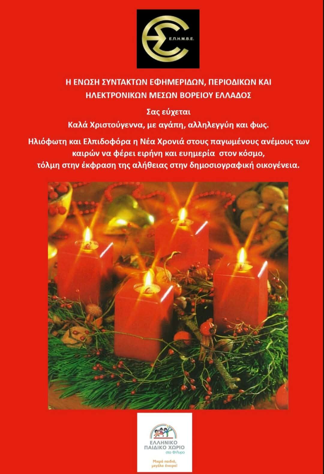 Συνεχίζοντας να δείχνει το “κοινωνικό της πρόσωπο” ή Ένωση Συντακτών Εφημερίδων Περιοδικών και Ηλεκτρονικών Μέσων Βορείου Ελλάδος , επέλεξε και με τις φετεινές Εορταστικές της Ευχές, να ενισχύσει κάποια Κοινωνική Δομή της χώρας μας. Για τη Διοίκηση της ΕΣΕΠΗΜΒΕ αποτελεί πλέον θεσμό η στήριξη κάποιου Κοινωφελούς Φορέα της Χώρας μας, μέσω των Εορταστικών Ευχών , κάθε έτους. Ευχαριστούμε την υπεύθυνη Δημοσίων Σχέσεων του Διοικητικού Συμβουλίου μας Ευδοξία (Βίκη) Κατράνα, για την επιμέλεια της προσεγμένης Ευχετήριας Κάρτας της Ένωσής μας !