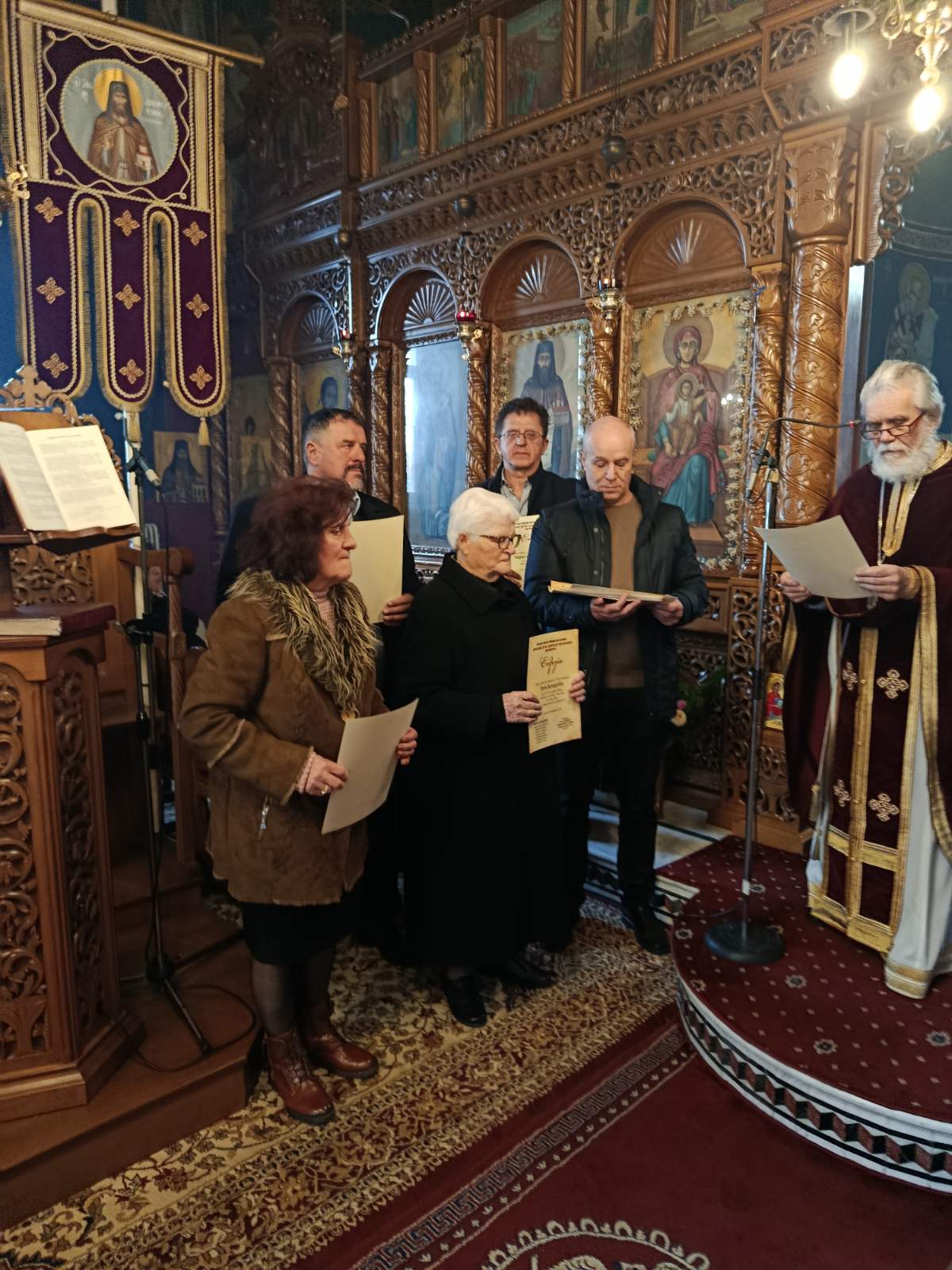 Συγχάρηκε τους απερχόμενους από το Εκκλ. Συμβούλιο (Άννα Κρομμύδα, Περικλή Παπαγεωργίου, Δημήτριο Στεφάνου) και από το Φιλόπτωχο (Άννα Γεωργάκη, Άννα Παπαδημητρίου) εξήρε την αφοσίωσή τους και την αγάπη τους στην Εκκλησία και στον Άγιο, με την πολυετή και ολοκάρδια διακονία, καλοσύνη και συνεργατικότητά τους, με το χαρούμενο και ανοιχτό πρόσωπο στο συνάνθρωπο, το σεβασμό τους στον Εφημέριο και στον Επίσκοπο-Μητροπολίτη, την άοκνη εξυπηρέτηση των πιστών, επέδωσε “Ευλογία” στον καθένα (σαν πτυχίο) και στη συνέχεια παρουσίασε στο εκκλησίασμα τα νέα μέλη του Εκκλ. Συμβουλίου και του Φιλόπτωχου. Συγχάρηκε τη νεωκόρο Θεοδώρα Δελνιώτη.