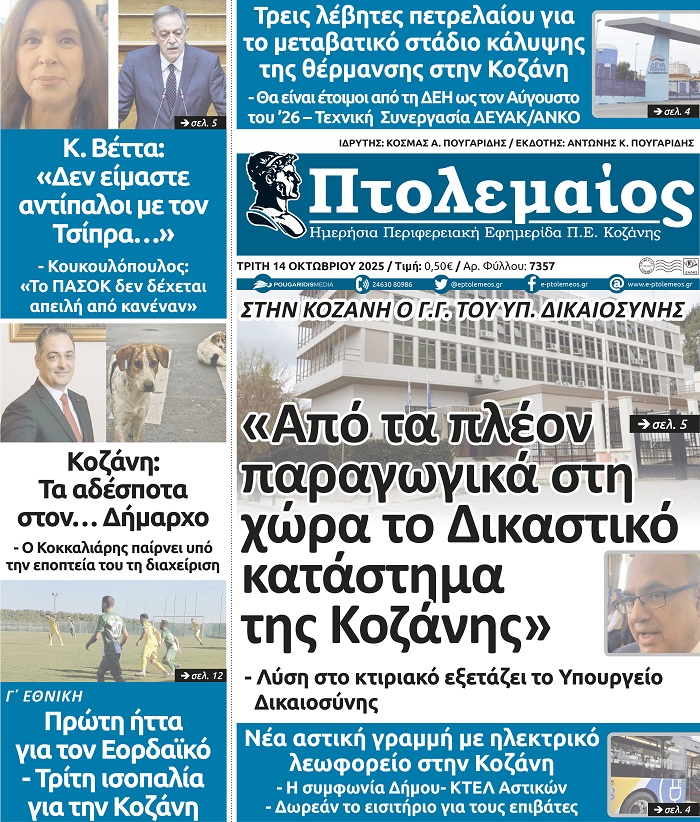 Το πρωτοσέλιδο του ΠΤΟΛΕΜΑΙΟΥ της Τρίτης 14/10