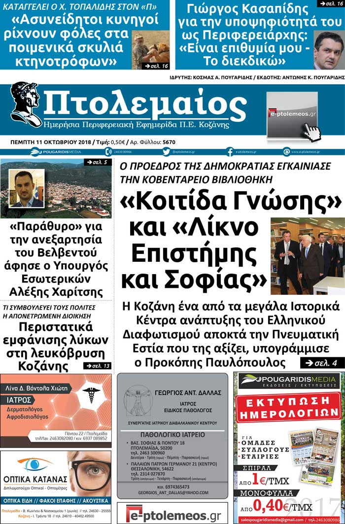 Το πρωτοσέλιδο του Πτολεμαίου της Πέμπτης 11/10/2018