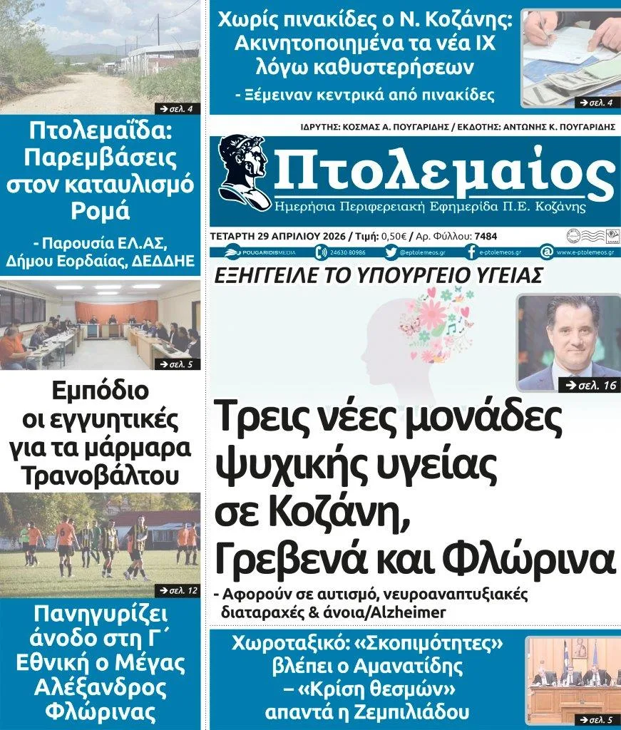 Το πρωτοσέλιδο του ΠΤΟΛΕΜΑΙΟΥ της Τετάρτης 29/4