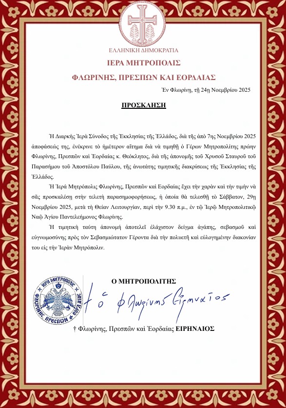 Η Ιερά Μητρόπολη Φλωρίνης, Πρεσπών και Εορδαίας έχει τη χαρά και την τιμή να σας προσκαλέσει στην τελετή παρασημοφορήσεως, η οποία θα τελεσθεί το Σάββατο 29 Νοεμβρίου μετά τη Θεία Λειτουργία περί τις 9:30 στον Ιερό Μητροπολιτικό Ναό Αγίου Παντελεήμονος Φλωρίνης.