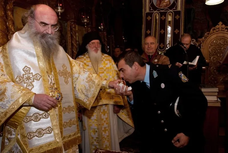 Κατά την ‘’εν ειρήνη’’ έξοδό τους από το Ναό οι πιστοί πήραν εορταστικό κέρασμα, ευλογία από τον Άγιο.