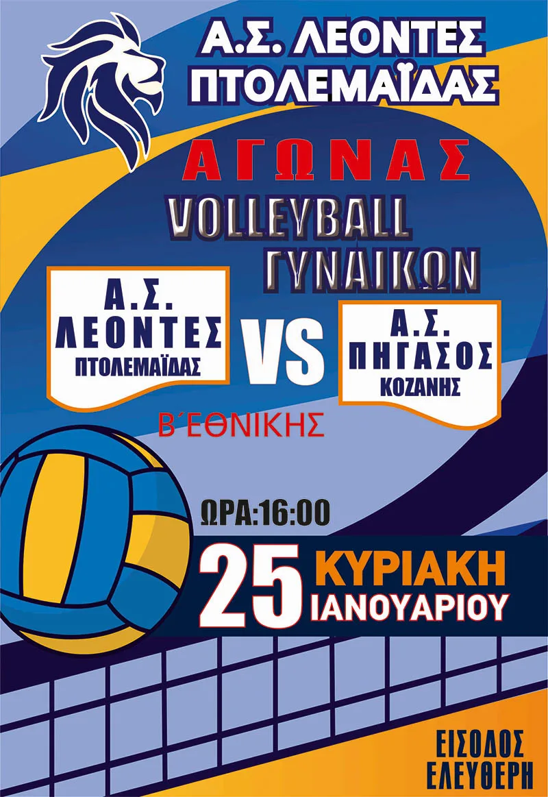Αγωνιστική δράση για το γυναικείο τμήμα βόλεϊ του Α.Σ. Λέοντες Πτολεμαΐδας, που υποδέχεται τον Α.Σ. Πήγασο Κοζάνης στο πλαίσιο του πρωταθλήματος της Β’ Εθνικής. Η αναμέτρηση θα διεξαχθεί την Κυριακή 25 Ιανουαρίου, με ώρα έναρξης 16:00, με στόχο ένα ακόμη θετικό αποτέλεσμα μπροστά στο κοινό της Πτολεμαΐδας. Η είσοδος είναι ελεύθερη και οι φίλοι του αθλήματος καλούνται να στηρίξουν την προσπάθεια των αθλητριών.