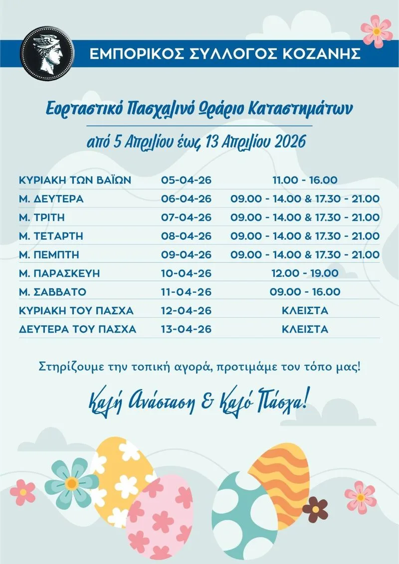 Το εορταστικό ωράριο των καταστημάτων ενόψει Πάσχα ανακοίνωσε ο Εμπορικός Σύλλογος Κοζάνης, το οποίο τίθεται σε ισχύ από τις 5 Απριλίου, Κυριακή των Βαΐων, σε μια περίοδο με αυξημένες προσδοκίες για την τοπική αγορά. Οι επαγγελματίες ευελπιστούν σε ενίσχυση της αγοραστικής κίνησης, ενώ παράλληλα απευθύνουν ευχές για υγεία, ειρήνη και μια καλή και ευλογημένη Ανάσταση σε όλους.