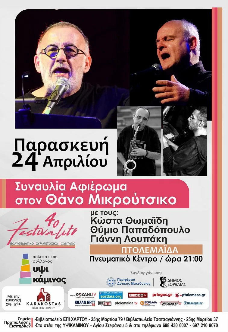 Μια ξεχωριστή μουσική βραδιά αφιερωμένη στον μεγάλο συνθέτη Θάνο Μικρούτσικο, έναν δημιουργό που σφράγισε το ελληνικό τραγούδι ενώνοντας την ποίηση με τη μουσική και αφήνοντας ένα έργο βαθιά χαραγμένο στη συλλογική μας μνήμη. Στη σκηνή συναντιούνται τρεις σημαντικοί συνεργάτες και συνοδοιπόροι του, ο ερμηνευτής Κώστας Θωμαΐδης, ένας από τους πιο στενούς και διαχρονικούς συνεργάτες του Μικρούτσικου στη δισκογραφία και στις συναυλίες του στην Ελλάδα και το εξωτερικό, ο κορυφαίος μουσικός και ενορχηστρωτής Θύμιος Παπαδόπουλος, τον οποίο ο ίδιος ο Μικρούτσικος αποκαλούσε «alter ego» του στη μουσική και ο πιανίστας και ενορχηστρωτής Γιάννης Λουπάκης. Μέσα από εμβληματικά τραγούδια και μελοποιημένη ποίηση μεγάλων δημιουργών, όπως ο Κωνσταντίνος Καβάφης, ο Γιάννης Ρίτσος, ο Νίκος Καββαδίας, ο Μάνος Ελευθερίου, ο Ναζίμ Χικμέτ, ο Άλκης Αλκαίος, ο Μανόλης Αναγνωστάκης και ο Μπέρτολτ Μπρεχτ, η συναυλία αναδεικνύει τη διαχρονική δύναμη του έργου του Θάνου Μικρούτσικου και την καλλιτεχνική του παρακαταθήκη.