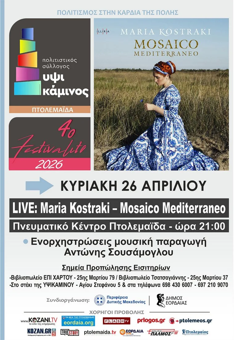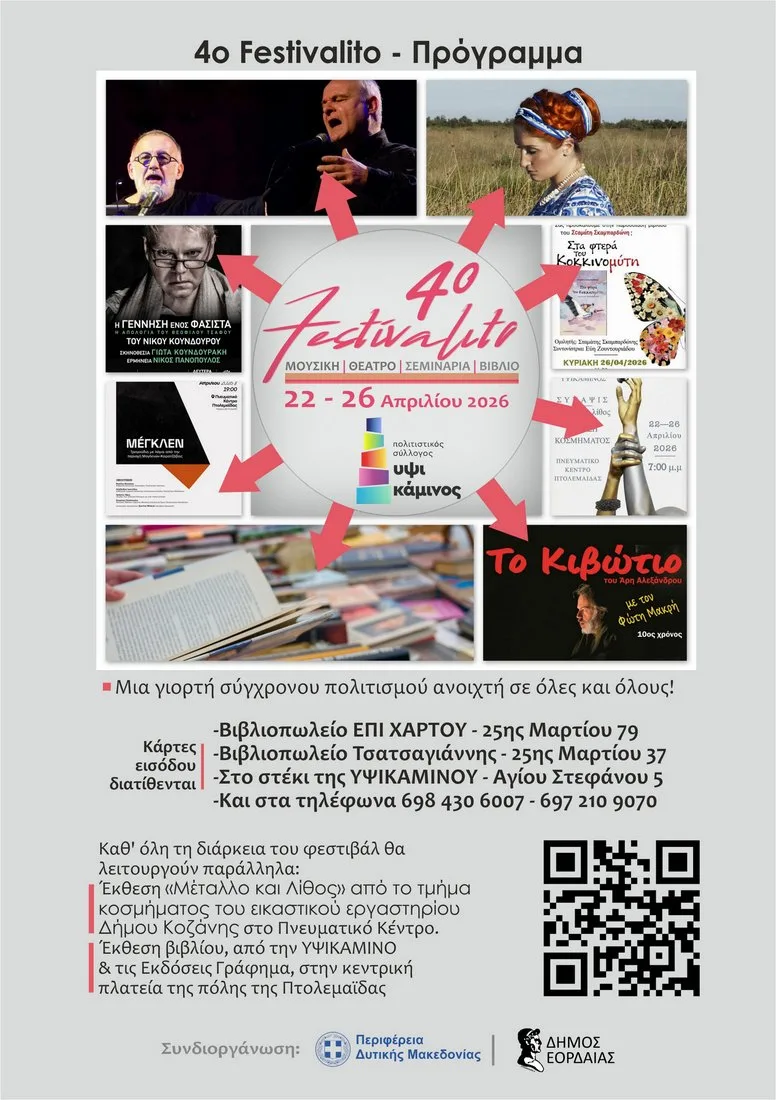 Ξεκινάει αύριο το πλούσιο φεστιβάλ 4ο Festivalito, του Πολιτιστικού Συλλόγου «ΥΨΙΚΑΜΙΝΟΣ». Μια γιορτή σύγχρονου πολιτισμού ανοιχτή σε όλες και όλους, που θα διαρκέσει από 22 έως 26 Απριλίου 2026 και θα αφορά σε: Βιβλίο – Σεμινάριο – Θέατρο – Μουσική – Εικαστικά.