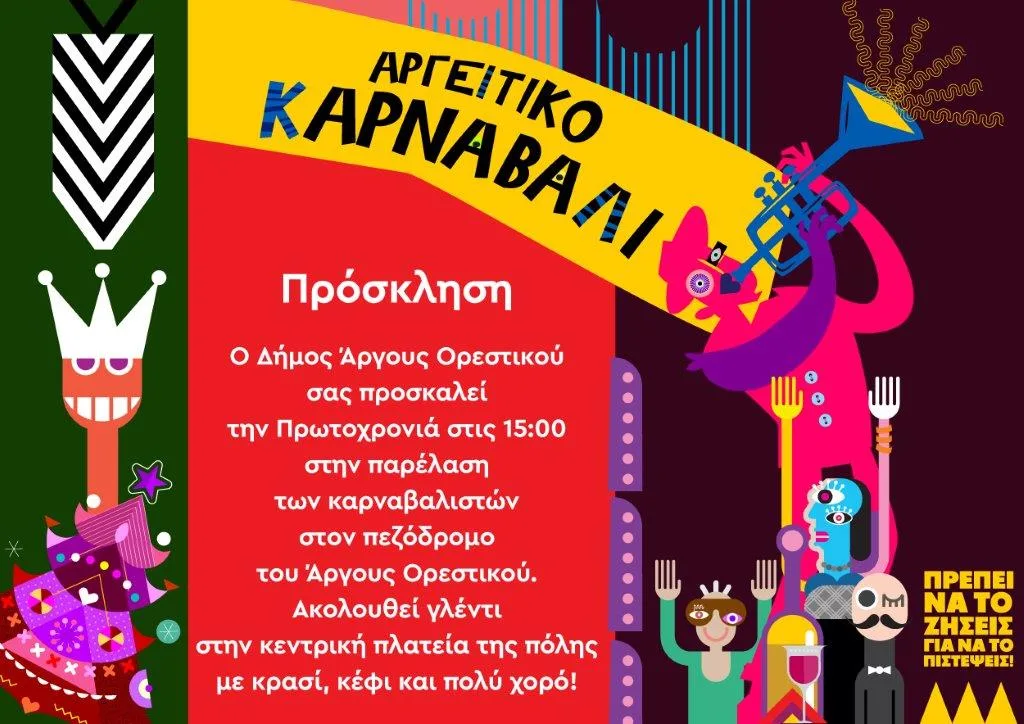 Με παρελάσεις, μουσική και ζωντανή διάθεση, το Άργος Ορεστικό ετοιμάζεται να υποδεχτεί τη νέα χρονιά μέσα από το Αργείτικο Καρναβάλι. Ο Δήμος καλεί δημότες και επισκέπτες στην καθιερωμένη πρωτοχρονιάτικη παρέλαση καρναβαλιστών και στο μεγάλο γλέντι που θα ακολουθήσει στην κεντρική πλατεία της πόλης.