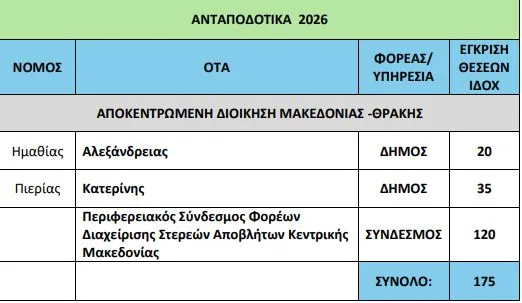 Το Υπουργείο Εσωτερικών ενέκρινε την πρόσληψη 175 ατόμων με σχέση εργασίας ιδιωτικού δικαίου ορισμένου χρόνου, διάρκειας έως 8 μήνες, σε υπηρεσίες ανταποδοτικού χαρακτήρα στους φορείς του παρακάτω πίνακα: