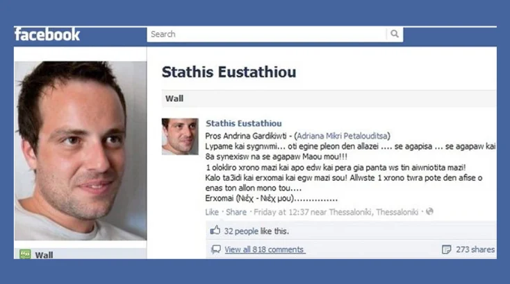 Στη συνέχεια, γύρισε στη Θεσσαλονίκη, όπου, σε μια κίνηση απόγνωσης και σκηνοθεσίας, ανέβασε μια υποκριτική ανάρτηση στο Facebook με αποδέκτη τη νεκρή του σύντροφο. Στην πραγματικότητα, προσπαθούσε να κερδίσει χρόνο για να διαφύγει από τη χώρα μέσω του Κιλκίς προς τα Σκόπια.
