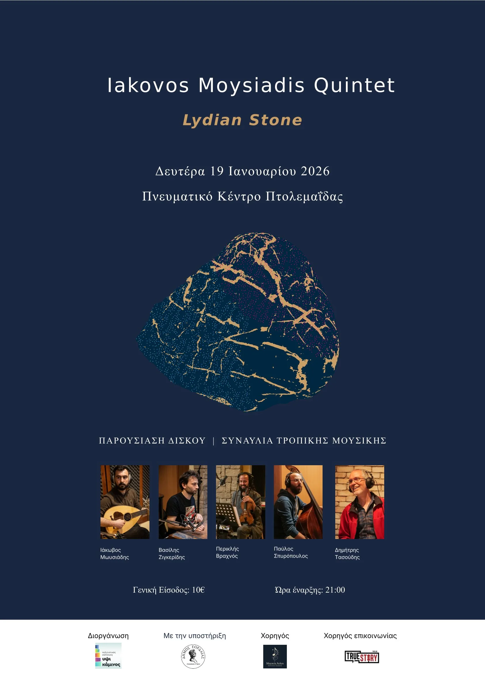 Η ΥΨΙΚΑΜΙΝΟΣ, τη Δευτέρα 19 Ιανουαρίου 2026, στις 21:00, στο Πνευματικό Κέντρο της Πτολεμαΐδας, παρουσιάζει τον Ιάκωβο Μωυσιάδη και το νέο του άλμπουμ με τίτλο “Lydian Stone”, καθώς και άλλες προσωπικές του συνθέσεις και σας καλεί σε μία συναυλία τροπικής μουσικής, η οποία περιλαμβάνει μουσικά ιδιώματα που χρησιμοποιούν τονική μουσική και έχουν παραδοσιακή πορεία. «Όπως οι πέτρες και το χώμα αποτελούν ένα αποτύπωμα του χρόνου στο σήμερα, εμφανίζοντας στη μορφή τους σημάδια ιστορίας, εξέλιξης και μετάλλαξης, εμπεριέχοντας όλα εκείνα τα στοιχεία που τους προσδίνουν διαφορετικές ποιότητες, υφές, χρώματα και τρόπους χρήσης, έτσι και εμείς ως φορείς της ιστορικής και της συλλογικής μας μνήμης, συμπυκνώνουμε όλες εκείνες τις εγγραφές και τα βιώματα που μας έχουν σημαδέψει και μας συγκινούν από το ασυνείδητο ως το συνειδητό μας. Ο δίσκος αυτός αποτελεί ένα προσωπικό αποτύπωμα που έχει περάσει από τη δοκιμασία της Λυδίας Λίθου και φανερώνει τα σημεία σταθμούς που τον έχουν επηρεάσει, δημιουργώντας έτσι ένα ψηφιδωτό με αναφορές στις παραδοσιακές τροπικές μουσικές του ελλαδικού χώρου και της Ανατολικής Μεσόγειο, με αποχρώσεις από τα Βαλκάνια και τη σύγχρονη world jazz» (Σημείωμα του καλλιτέχνη).
