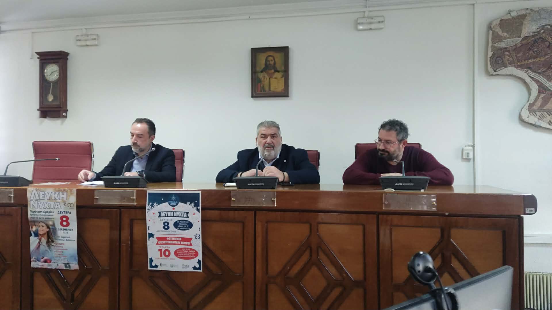 Ο κ. Βυθούλκας αναφέρθηκε στη Λευκή Νύχτα που θα πραγματοποιηθεί σήμερα το απόγευμα με διεύρυνση του ωραρίου λειτουργίας των καταστημάτων, ειδικές προσφορές και δράσεις από Πολιτιστικούς Συλλόγους στους δρόμους της πόλης. Η Λευκή Νύχτα αποφασίστηκε να γίνει ξεχωριστά από το άναμμα του δέντρου για να μπορούν όλοι οι εργαζόμενοι σε καταστήματα και οι έμποροι να απολαύσουν την Τετάρτη την εκδήλωση και τη συναυλία με τις οικογένειές τους και οι πολίτες να πραγματοποιήσουν με άνεση τις αγορές τους στη στολισμένη πόλη. Τονίστηκε η στενή συνεργασία του Δήμου με τον Εμπορικό Σύλλογο σε κοινές δράσεις τόνωσης της τοπικής οικονομίας και των επαγγελματιών της περιοχής.
