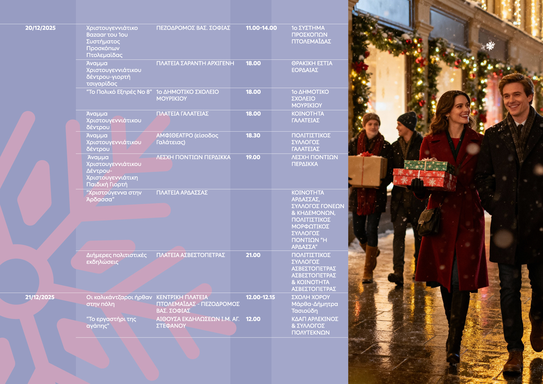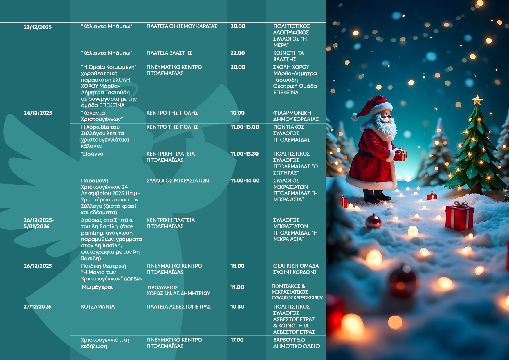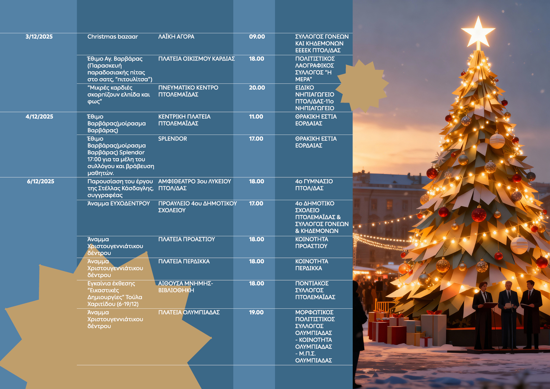 Πλήθος δράσεων με αναμμένα χριστουγεννιάτικα δέντρα, θεατρικά και μουσικά δρώμενα, γιορτινά bazaar, διαδρομές με το τρενάκι της πόλης και αναβιώσεις τοπικών εθίμων περιμένουν τους κατοίκους της Πτολεμαΐδας και των Τοπικών Κοινοτήτων που θα ζωντανέψουν το γιορτινό κλίμα των Χριστουγέννων στην πόλη αλλά και στις ψυχές.