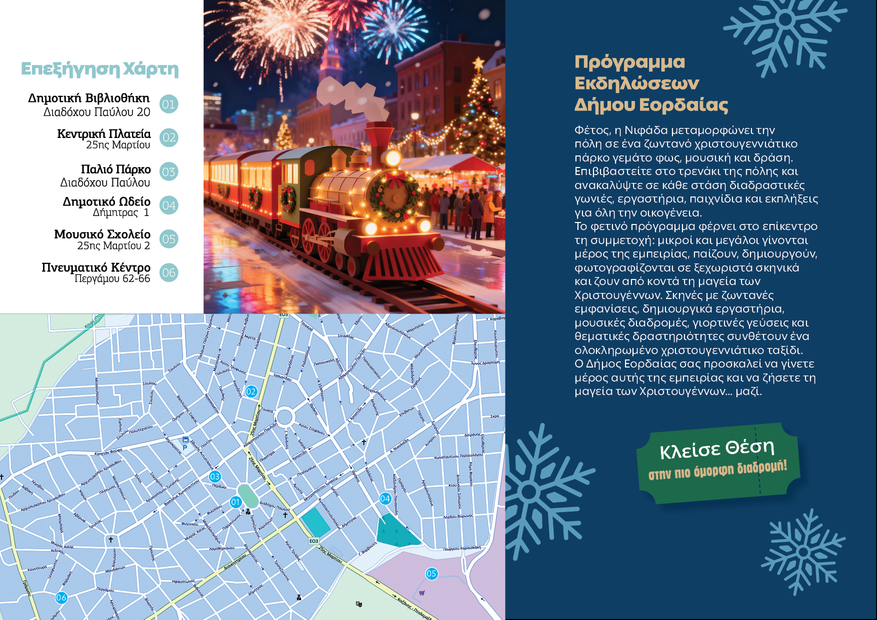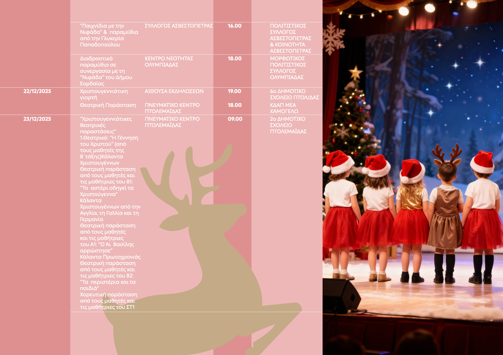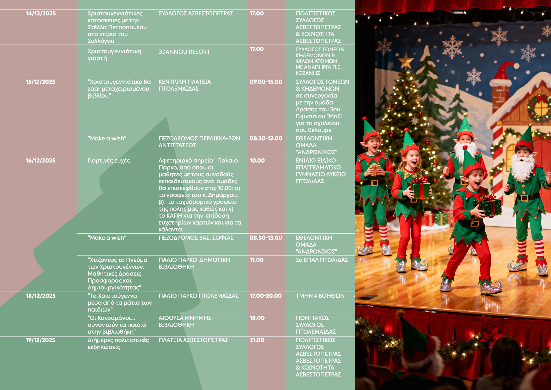 Πλήθος δράσεων με αναμμένα χριστουγεννιάτικα δέντρα, θεατρικά και μουσικά δρώμενα, γιορτινά bazaar, διαδρομές με το τρενάκι της πόλης και αναβιώσεις τοπικών εθίμων περιμένουν τους κατοίκους της Πτολεμαΐδας και των Τοπικών Κοινοτήτων που θα ζωντανέψουν το γιορτινό κλίμα των Χριστουγέννων στην πόλη αλλά και στις ψυχές.